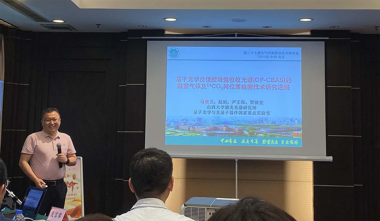 山西大學(xué)量子光學(xué)與光量子器件國家重點(diǎn)實(shí)驗(yàn)室、山西國惠華光碳監(jiān)測技術(shù)負(fù)責(zé)人馬維光教授受邀參與了此次會議,馬教授就“基于光學(xué)反饋腔增強(qiáng)吸收光譜的溫室氣體及 14CO2 同位素檢測技術(shù)研究進(jìn)展”的主題進(jìn)行了學(xué)術(shù)報(bào)告。發(fā)言中,馬教授結(jié)合雙碳目標(biāo)和我國生態(tài)環(huán)境碳監(jiān)測政策的研究背景,分析報(bào)告了“激光吸收光譜技術(shù)”、“光學(xué)反饋腔增強(qiáng)激光吸收光譜技術(shù)”、“高精度CO2、 CH4檢測技術(shù) ”和“14CO2激光檢測技術(shù)”多項(xiàng)技術(shù),探討了我國在溫室氣體監(jiān)測技術(shù)領(lǐng)域的發(fā)展現(xiàn)狀與挑戰(zhàn),對未來我國碳監(jiān)測工作部署提出了意見建議。